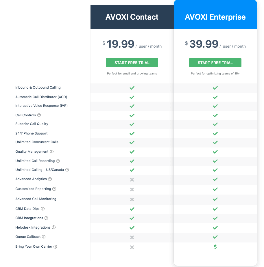 The AVOXI Contact Center uses a per-user subscription model tiered on available features. While it doesn't follow a hybrid price model directly, it plays a role in our overall hybrid pricing strategy: